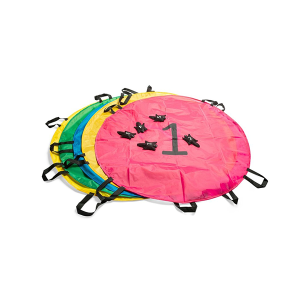 1 peonza diametro 40 cm. y altura 50 cm, 6 discos de plástico y 1 guía didáctica.